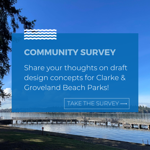 Tucked into two Mercer Island neighborhoods, Clarke and Groveland Beaches are much-loved public waterfront parks. Both sites were developed in the 1960s and 1970s, and their waterfront infrastructure and other park facilities are aging. To plan for the future of these parks, the City engaged The Berger Partnership, a leading landscape architecture and urban design firm that has partnered on many Mercer Island projects.