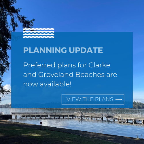 Tucked into two Mercer Island neighborhoods, Clarke and Groveland Beaches are much-loved public waterfront parks. Both sites were developed in the 1960s and 1970s, and their waterfront infrastructure and other park facilities are aging. To plan for the future of these parks, the City engaged The Berger Partnership, a leading landscape architecture and urban design firm that has partnered on many Mercer Island projects.