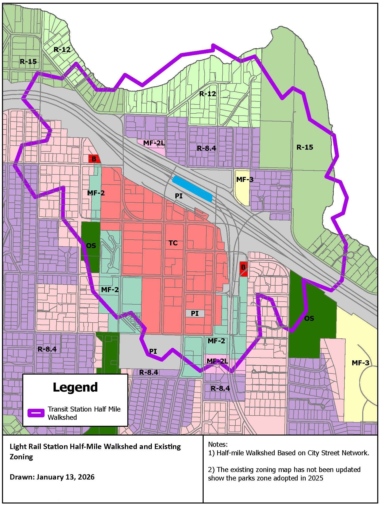 A map of the half-mile walkshed from the light rail station.