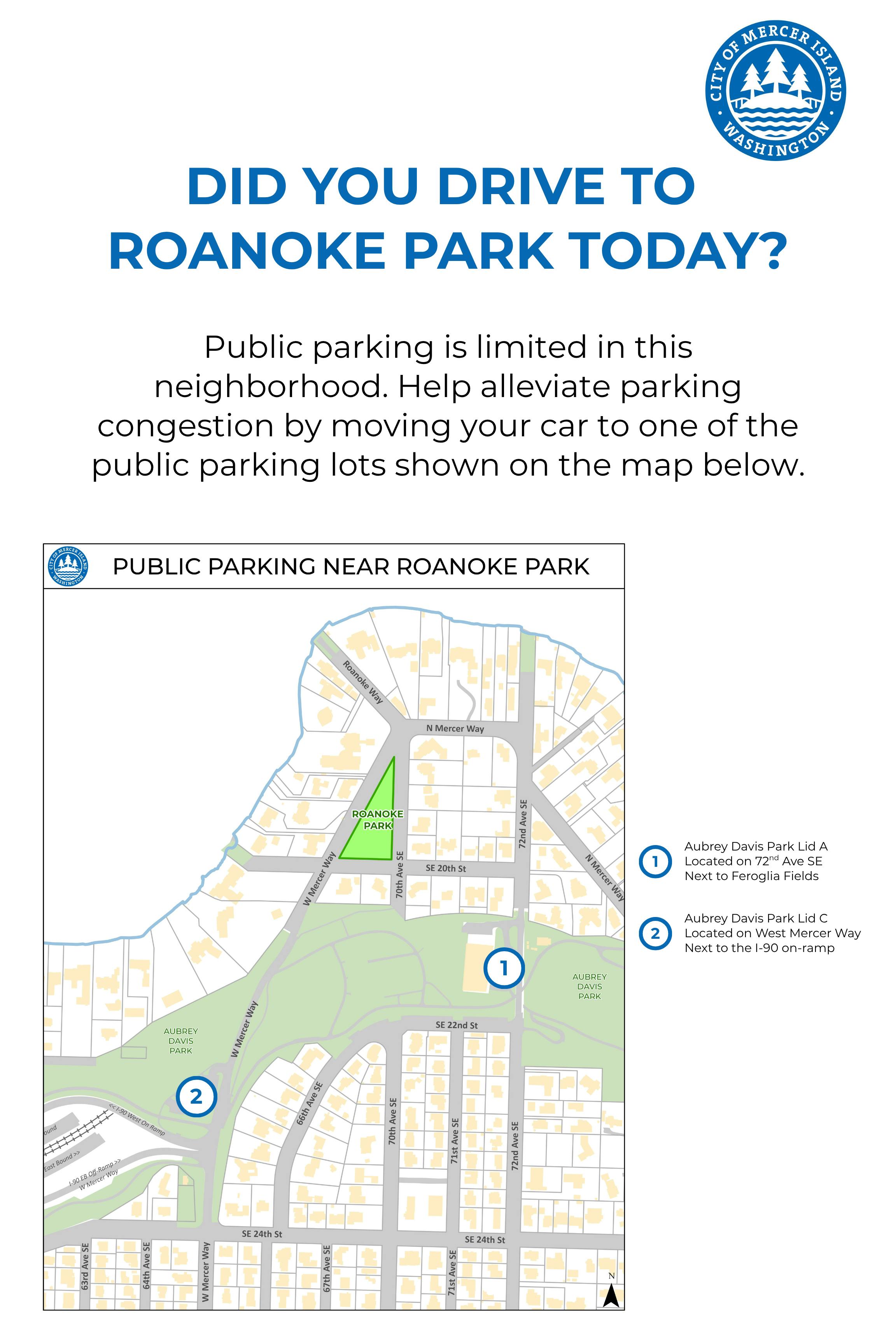 There are two available parking stalls at this neighborhood playground - 1 paved ADA stall and 1 gravel general stall. Parking is also available nearby at Aubrey Davis Park Lids A (72nd Ave SE) and C (West Mercery Way). If you live near Roanoke Park, consider walking or biking to the playground instead of driving given the limited parking.